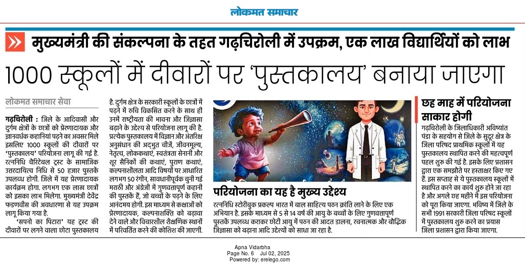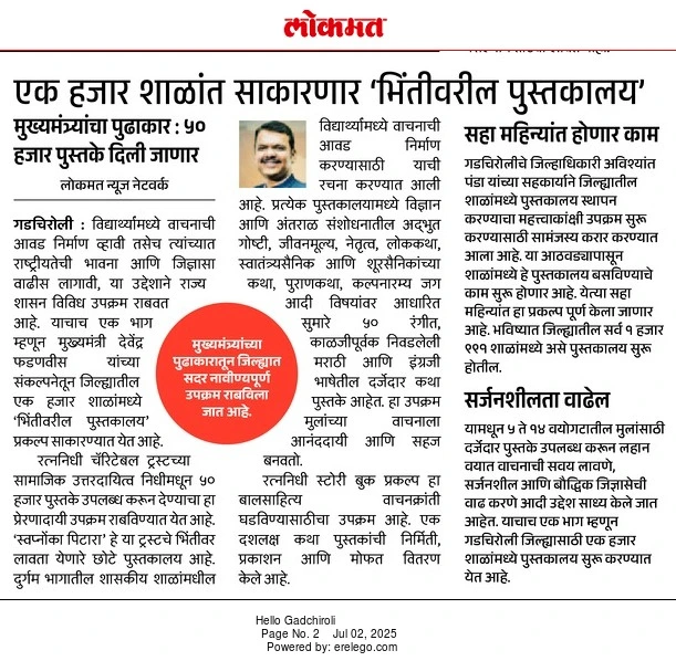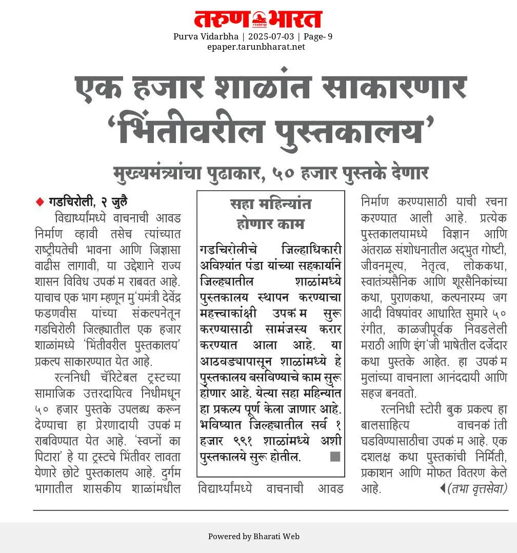 Inspired by the vision of Chief Minister Devendra Fadnavis, an inspiring and knowledge-giving initiative is being launched in the tribal and remote parts of Gadchiroli district to set up wall libraries in one thousand schools