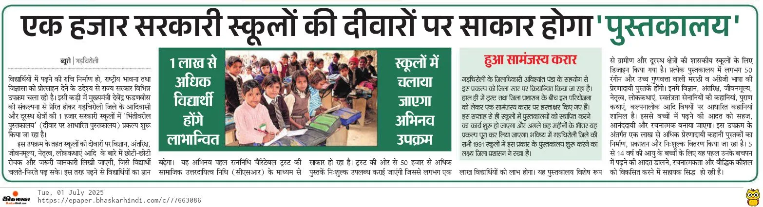 As part of this, inspired by the vision of Chief Minister Devendra Fadnavis, an inspiring and knowledge-giving initiative is being launched in the tribal and remote parts of Gadchiroli district to set up wall libraries in one thousand schools.