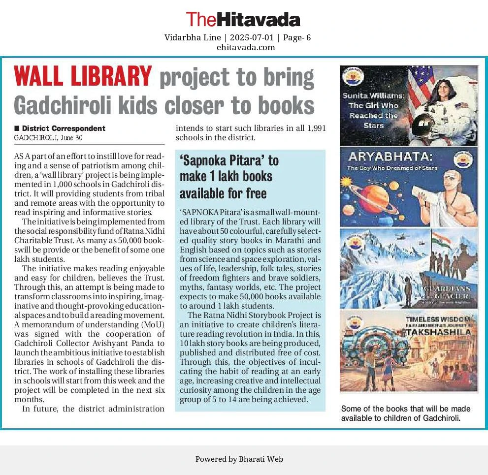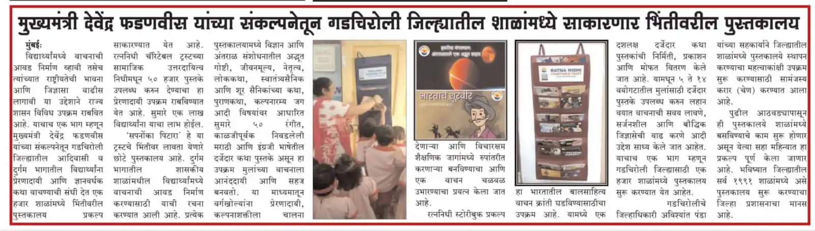 Under the vision of Chief Minister Devendra Fadnavis, inspired by this resolution, Gadchiroli district will start the 'Library on Wall' project in one thousand schools, making available over 50 types of books for free through the social initiative of Ratnanidhi Trust.