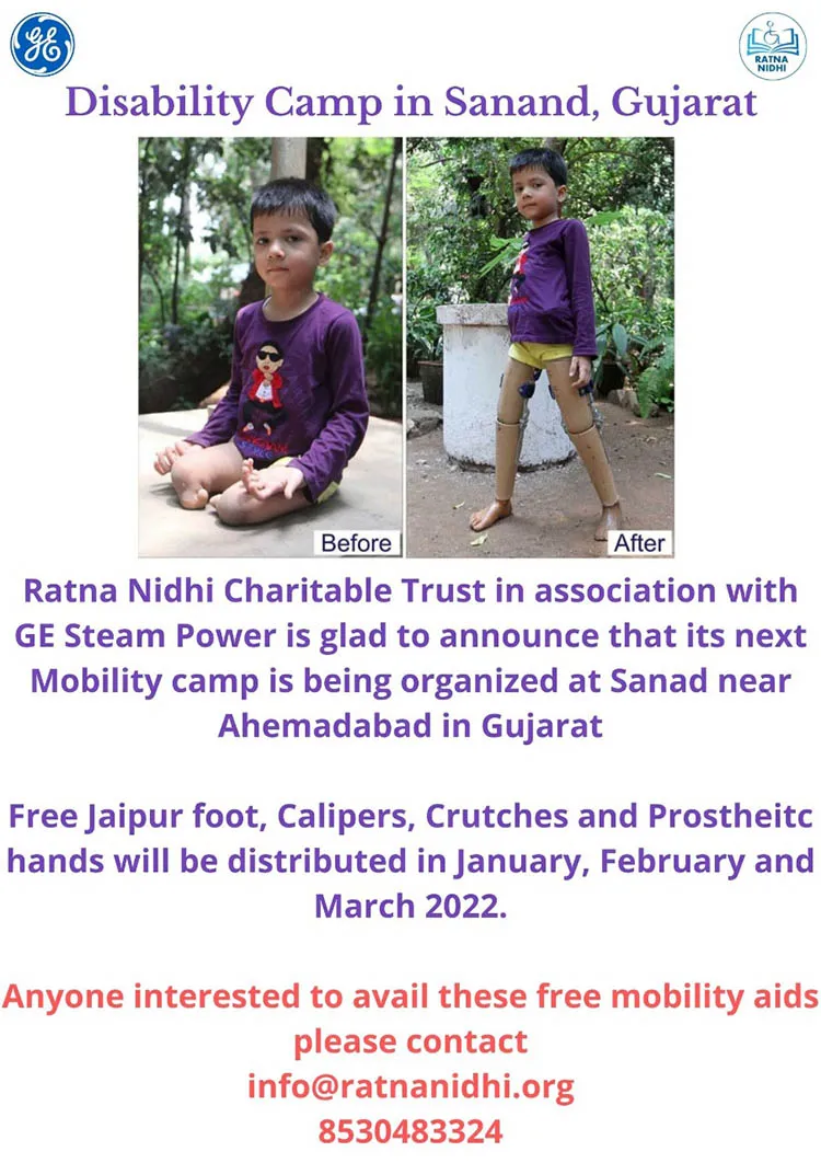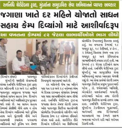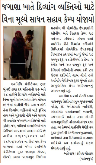 Ratnanidhi Charitable Trust, Jagana Center, Palanpur City in Collaboration with Rotary Club Palanpur City organized Project Disability to Ability. Support provided to 82 patients, and 42 devices have been provided-