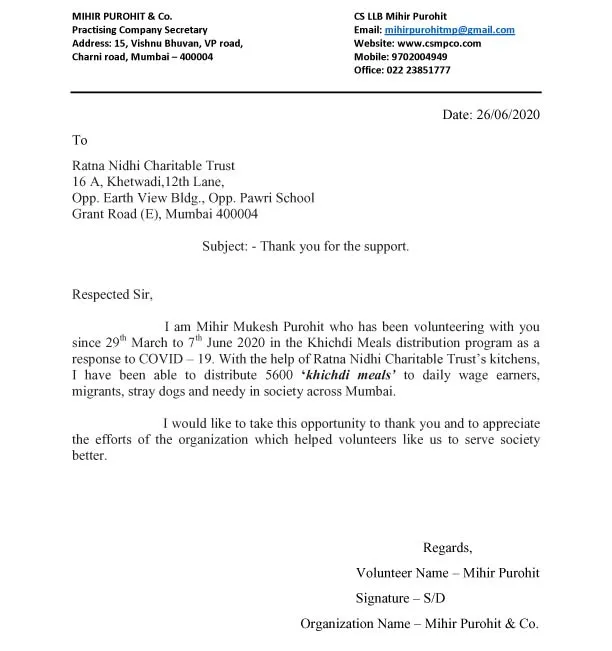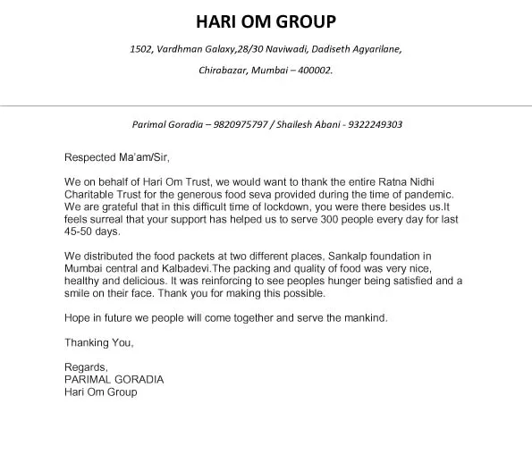 LETTER OF THANKS - MR. PARIMAL GARODIA - HARI OM GROUP