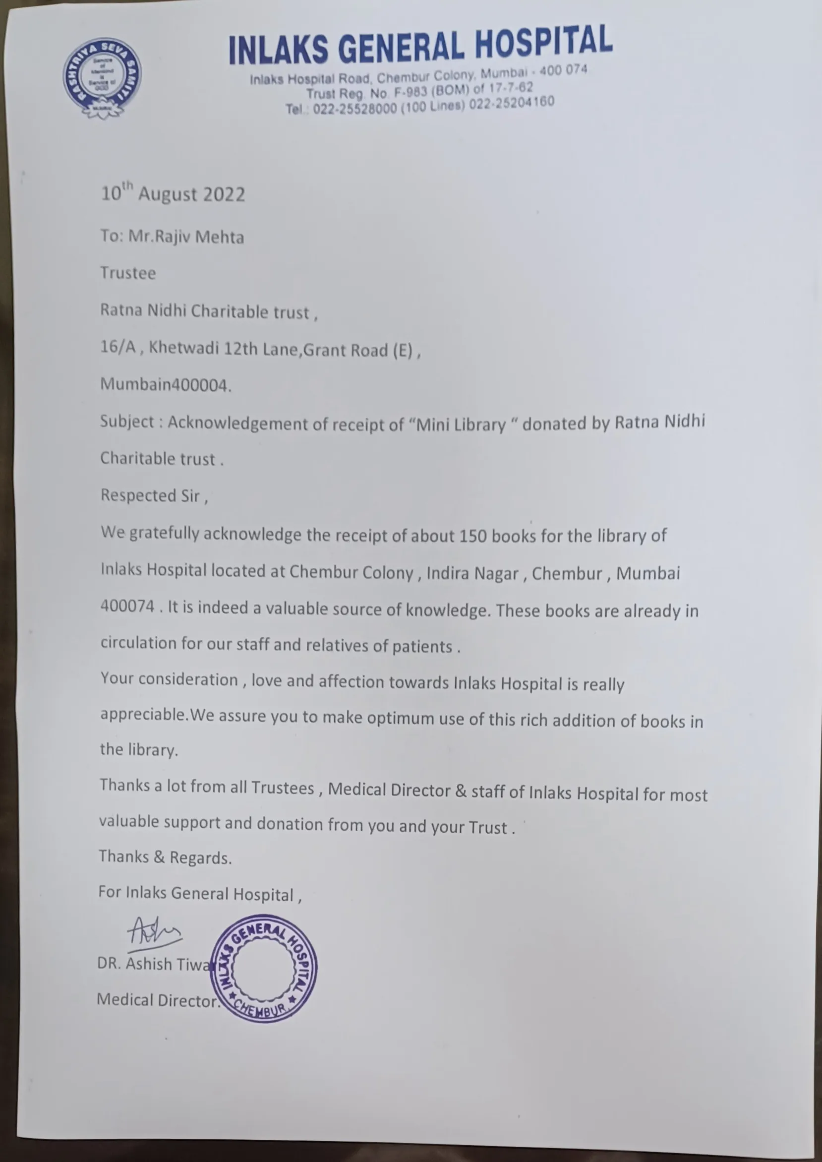 LETTER OF ACKNOWLEDGEMENT OF MINI LIBRARY - INLAKS GENERAL HOSPITAL - CHEMBUR - DR. ASHISH TIWARI, MEDICAL DIRECTOR.